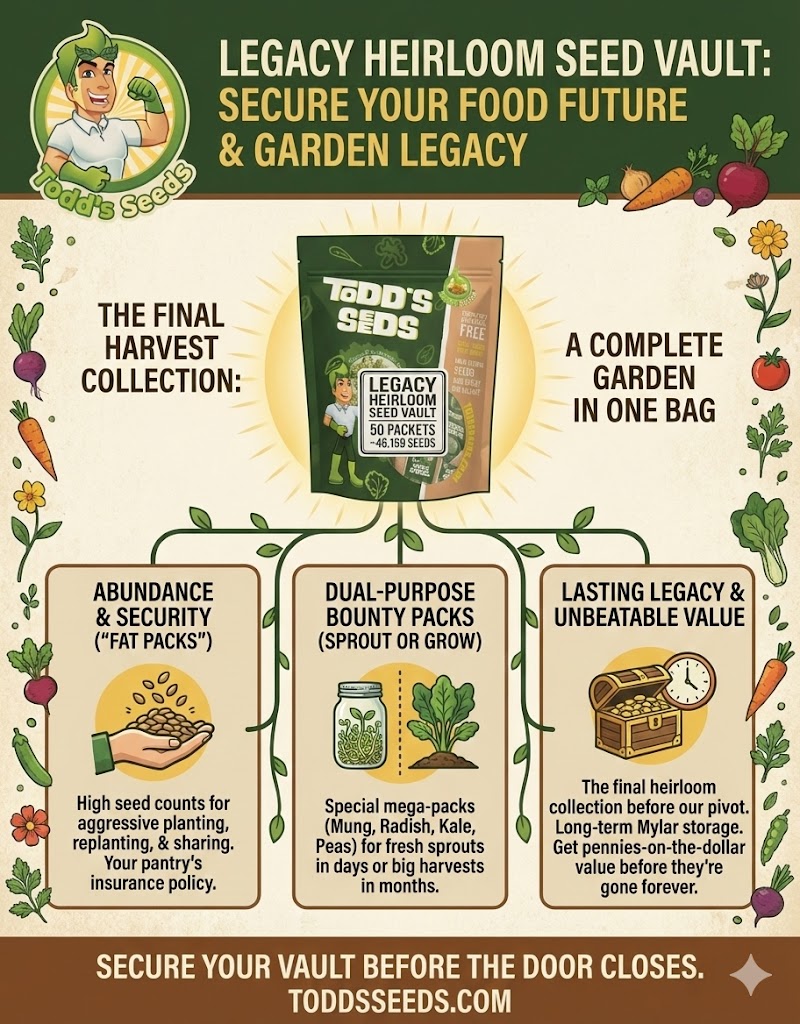 The Final Harvest Seed Vault Collection. As Todd’s Seeds pivots exclusively to Sprouting Seeds, we are opening our vault one last time. This is not a standard seed kit—this is a massive liquidation event.