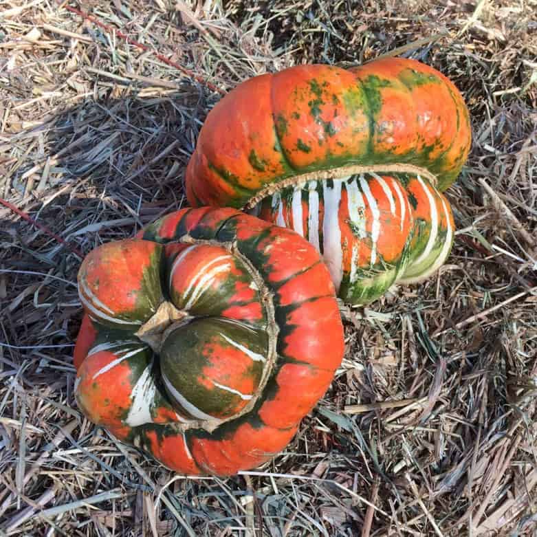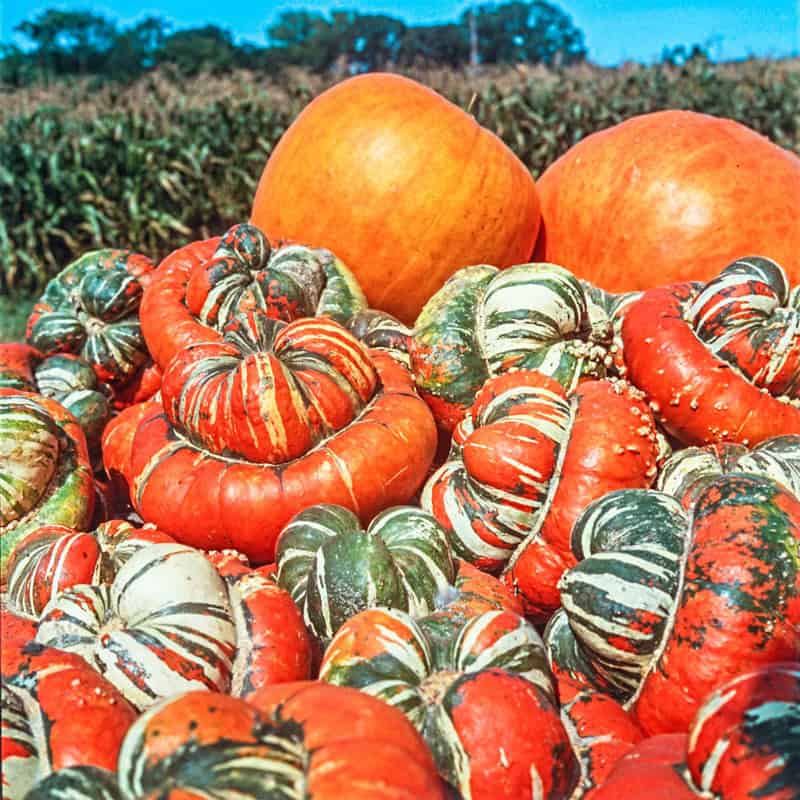 Brightly colored ornamental squash has large, flattened fruits measuring 8 to 10 inches across. “Buttons” striped with scarlet, white, orange, cream and green. Edible.